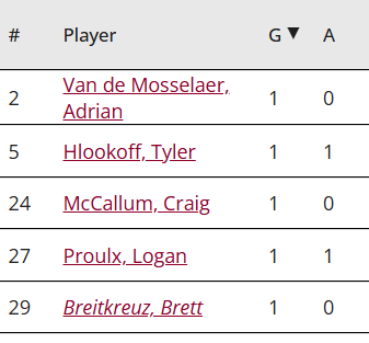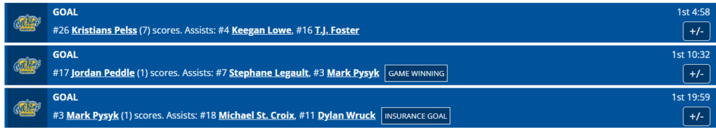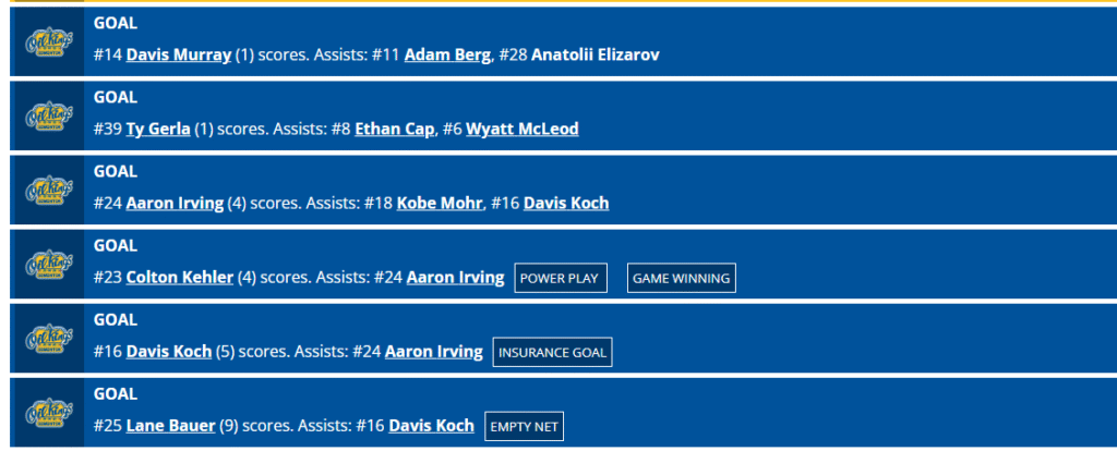 Between Matthew Robertson and Keagan Slaney goals were five Prince Albert Raider goals. Scott Atkinson goat a 10-minute misconduct for not wearing his mouthguard. Safety rules being enforced is always a good thing.